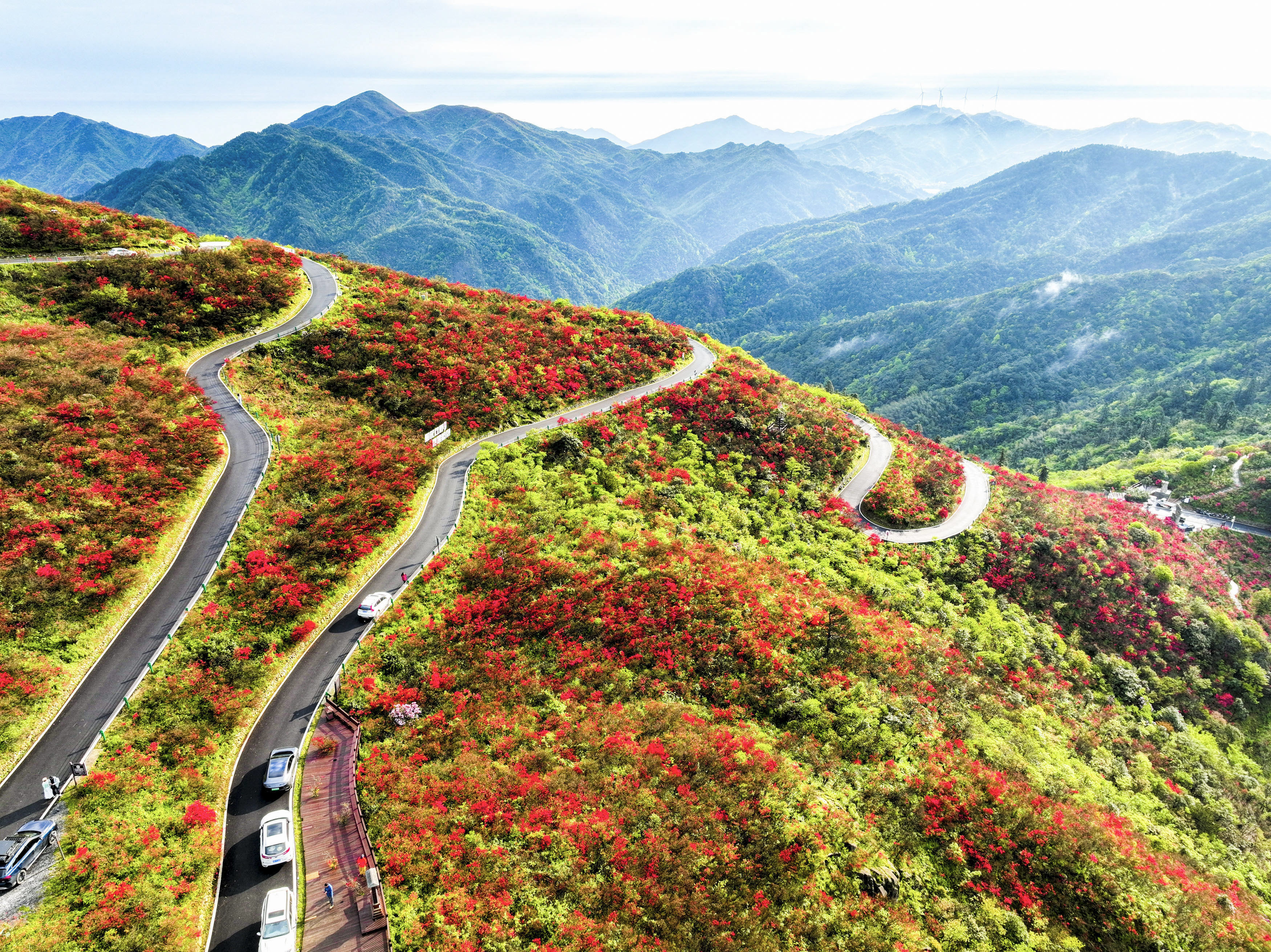 4月23日,游客在湖南省永州市双牌县阳明山国家森林公园杜鹃花海赏花游玩(无人机照片)。新华社发(曹正平摄)