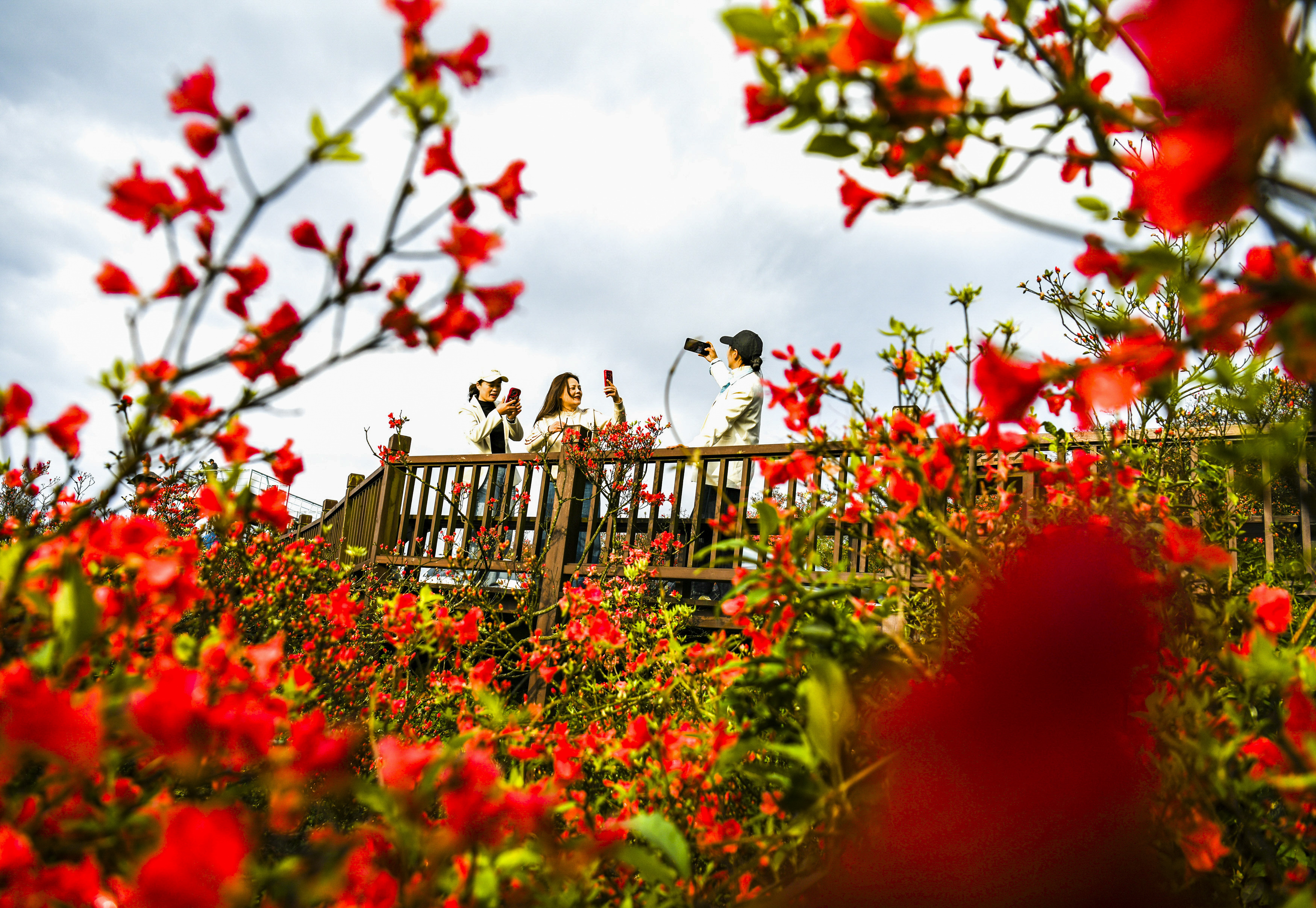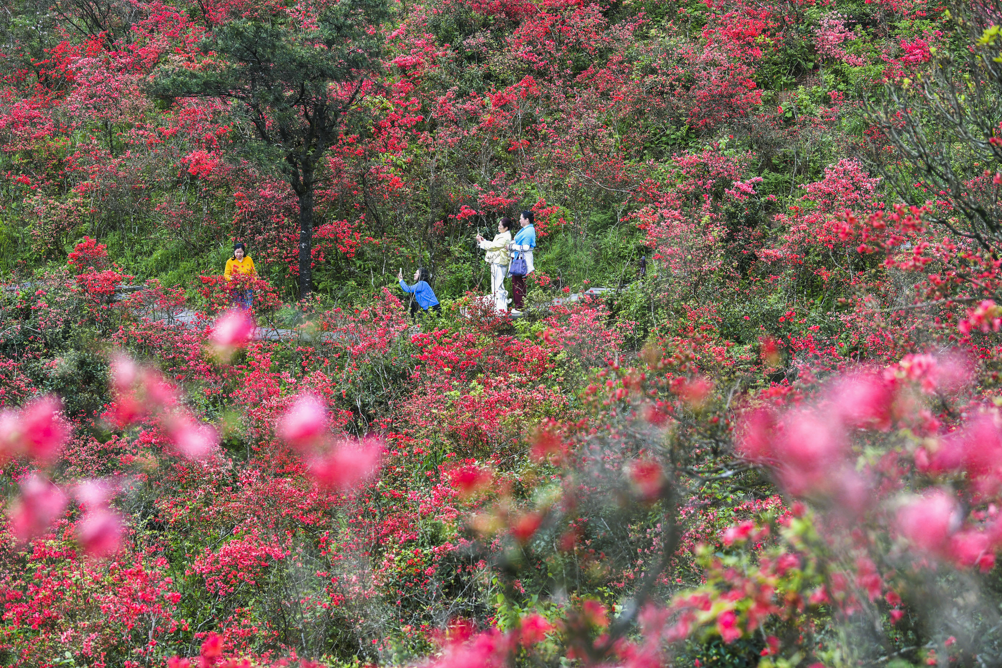4月23日,游客在湖南省永州市双牌县阳明山国家森林公园杜鹃花海赏花游玩。新华社发(周秀鱼春摄)