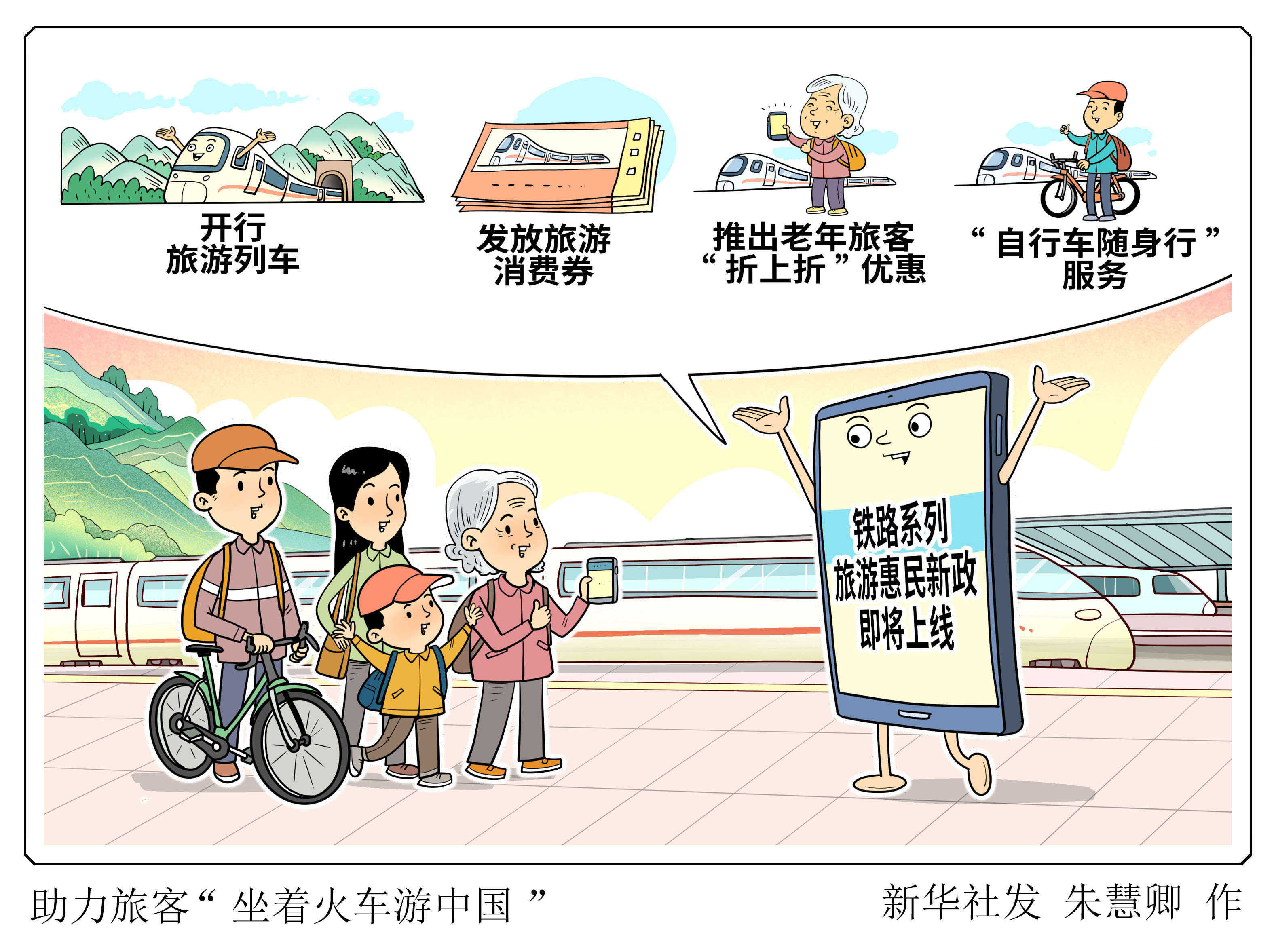 记者4月24日从中国国家铁路集团有限公司获悉,随着“5·19中国旅游日”临近,铁路部门将推出旅游惠民系列出行服务新举措,从开行旅游列车、发放旅游消费券,到推出老年旅客“折上折”优惠和“自行车随身行”服务,助力更多旅客“坐着火车游中国”,激活服务消费新的增长点,为旅游经济、银发经济发展注入新动能。