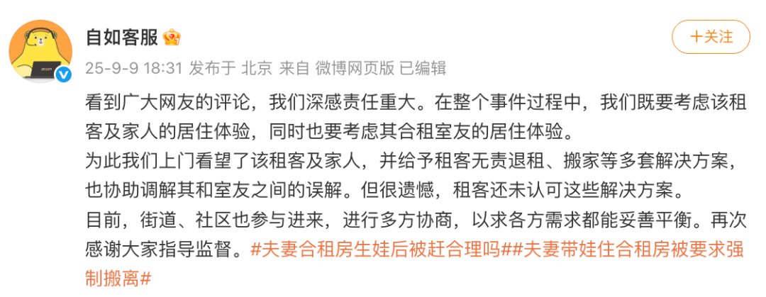 9月9日,自如客服官方微博发文称,“在整个事件过程中,我们既要考虑该租客及家人的居住体验,同时也要考虑其合租室友的居住体验。为此我们上门看望了该租客及家人,并给予租客无责退租、搬家等多套解决方案,也协助调解其和室友之间的误解。但很遗憾,租客还未认可这些解决方案。目前,街道、社区也参与进来,进行多方协商,以求各方需求都能妥善平衡。”
